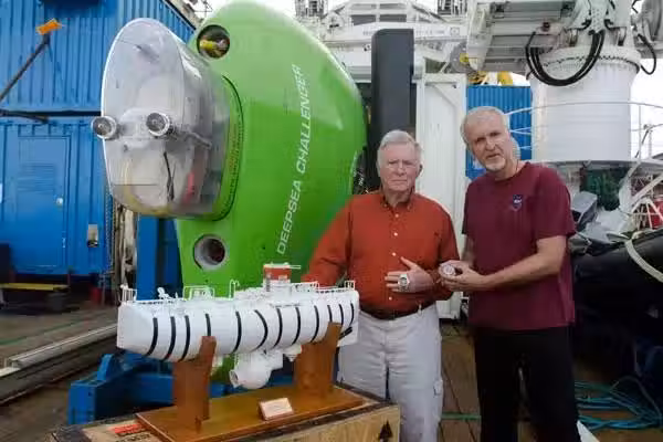 2012年,卡梅隆深潛馬里亞納海溝的考察船上,唐•沃爾什與卡梅隆(右)在Deepsea Challenger深潛器前合照,前面為的里雅斯特號深潛器模型。他們分別手持1960年版Deepsea Special 實驗型腕錶與2012年版的Deepsea Challenge實驗版腕錶(右)。
