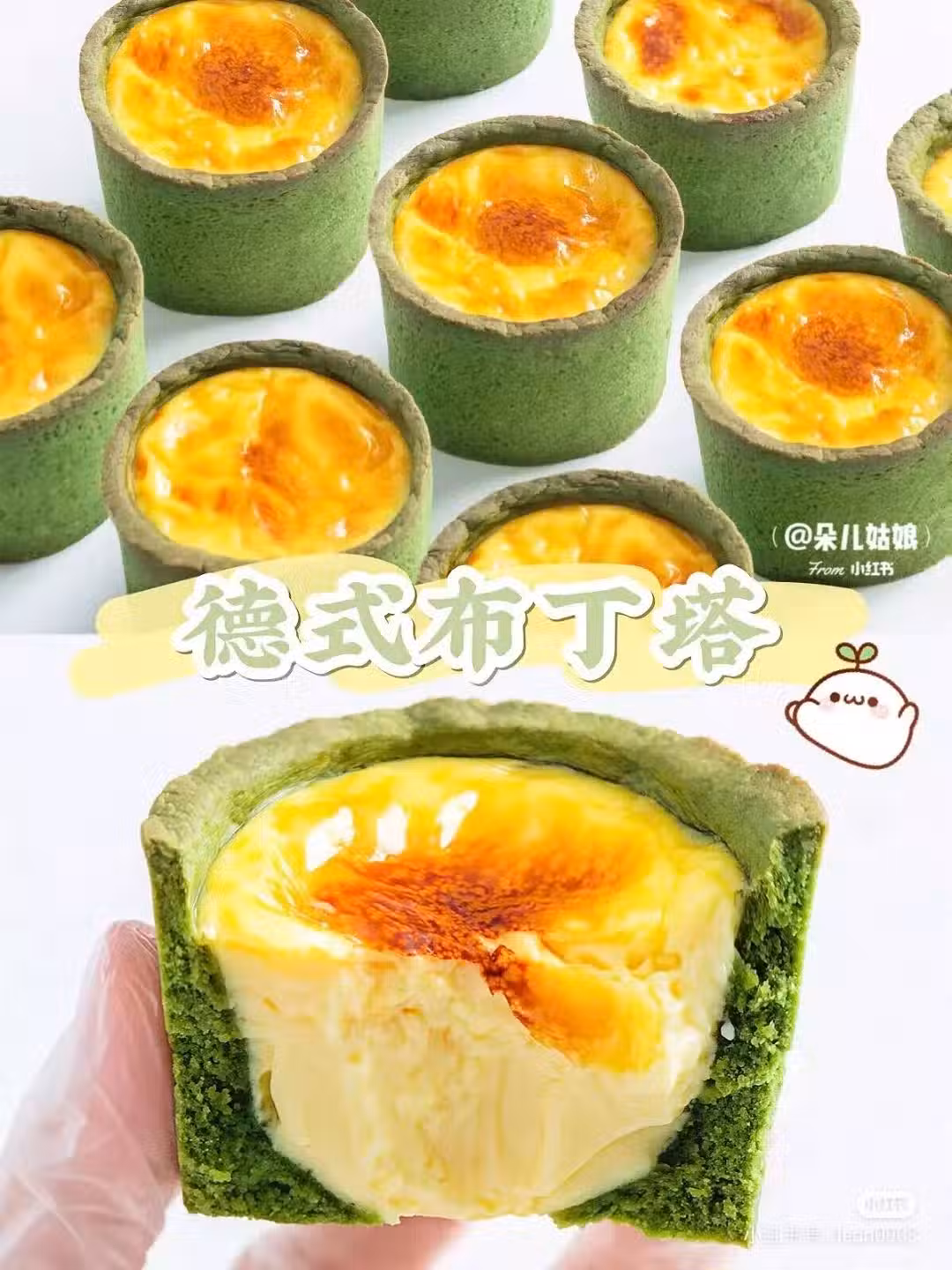 今天做了抹茶口味的, 德式布丁塔,外層像曲奇一樣酥脆,帶著清新的抹茶香內里布丁嫩滑可口~