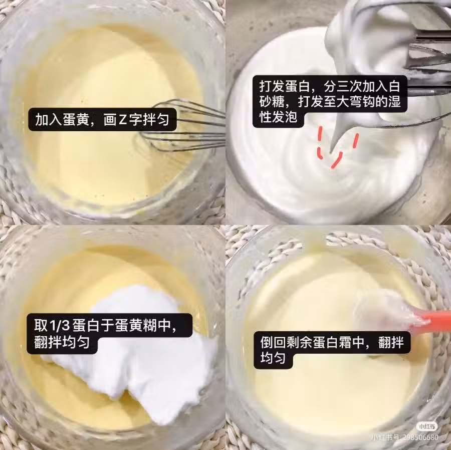 7. 將蛋糕糊倒入模具裡,放入預熱好的烤箱。烤盤可以倒入大約2cm的熱水,以水浴法烘烤蛋糕,以上下火150攝氏度烘烤45分鐘。每一個烤箱的溫度不一樣,多注意蛋糕表面的顏色轉變。