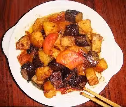 食材: 長茄子一根、土豆一個、西紅柿一個、鹽、油、胡椒粉、姜粉、十三香、生抽。