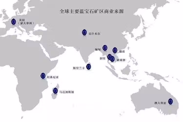 緬甸的藍寶石主要產在抹谷地區,是目前市場上倍受追捧的藍寶石產地之一。產自偉晶岩、霞石剛玉岩和正長岩中,因含鈦致色,故呈鮮艷的藍色,含絹絲狀金紅石和指紋狀液態包裹體。