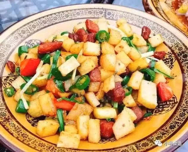 材料:豬頸肉即糟頭肉 、土豆、蒜苗節、甜酒釀(即醪糟)、鹽、醬油、料酒、醋、干辣椒、花椒、蔥油、豬油。