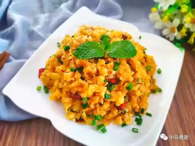 2.起鍋燒油,下入蒜末和酸菜碎爆香,下入辣椒麵或者酸辣椒炒香,下入洋芋泥,調入食鹽、雞精味精翻炒均勻,撒入蒜苗花或者蔥花翻炒均勻即可出鍋裝盤。這道菜的烹調方法比較隨意,可以根據個人口味加入調味品,做好了沒牙口的也能吃。