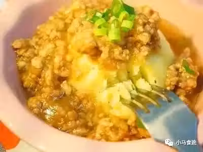 1. 先將土豆洗凈、去皮、切塊。將鮮肉切成小丁。