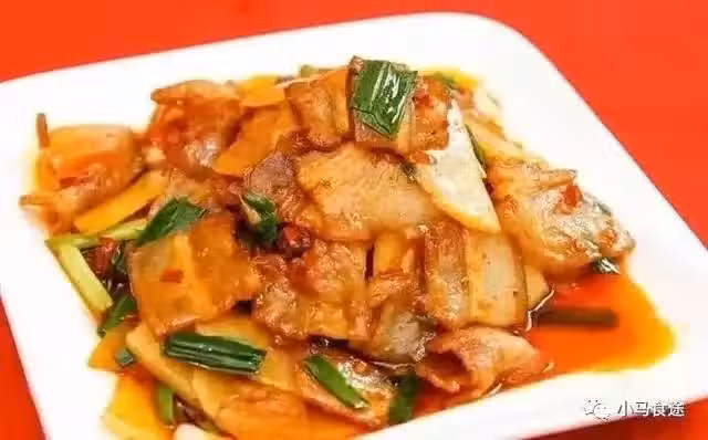 1. 豬坐臀肉煮熟切片,土豆去皮切成與肉相等的片,蒜苗切段。
