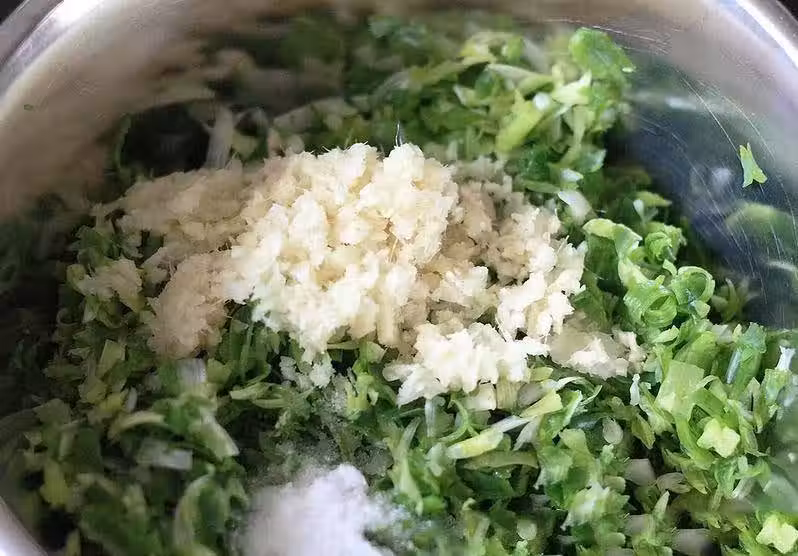 2、將細薑末和鹽放入蔥花中拌勻。