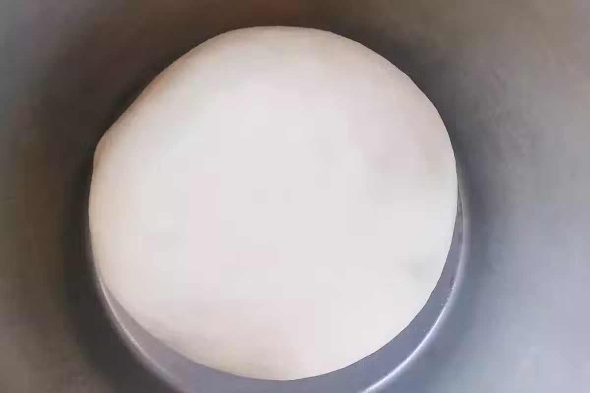 步驟4:然後在面板上撒一些乾麵粉,將麵糰轉移到面板上,進行揉搓,麵糰變得越來越光滑,直到可以拉出薄膜即可,此處不需要拉出手套膜,普通的薄膜就行。然後蓋上保鮮膜,室溫下發酵到兩倍大。
