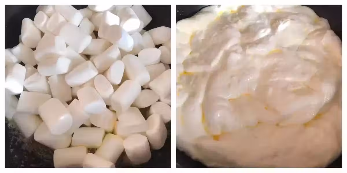2、棉花糖炒至完全融化後,加入提前混合好的奶粉和抹茶粉,這個時候就可以關火了,將奶粉與棉花糖混拌均勻。