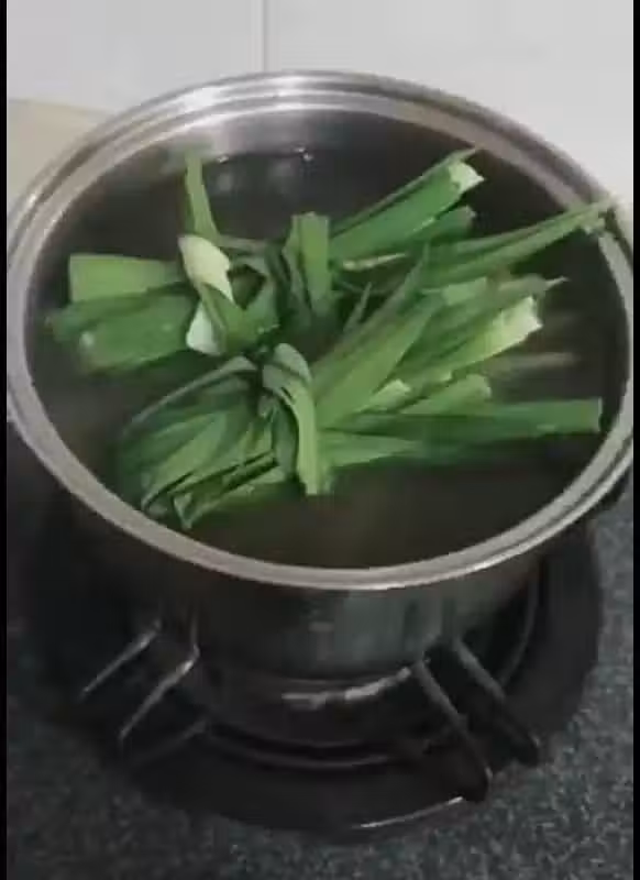 3)水煮滾後把拍扁的香茅放進去煮15分鐘,然後下香蘭葉煮多10分鐘。