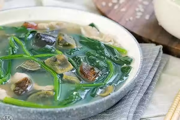 裡脊肉100g.菠菜230g.大米30g.雞蛋1個.皮蛋1個.蒜頭1瓣、植物油2g、鹽2g、清水1200ml