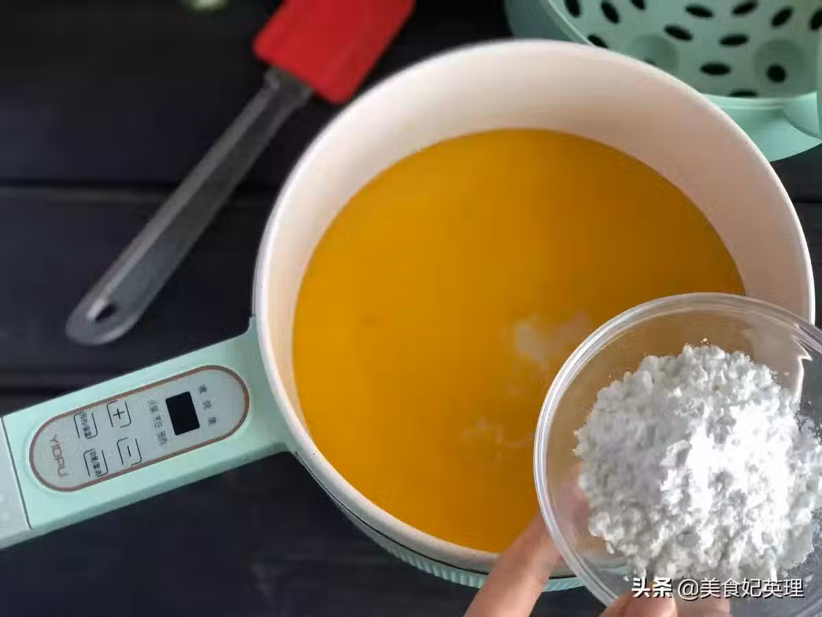 3.南瓜泥倒入鍋中,加入煉乳和玉米澱粉,用刮刀攪拌均勻,至順滑無顆粒