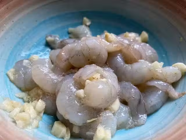 步驟1:蝦仁清洗乾淨,加入蒜末、鹽、胡椒粉和料酒拌勻,腌製片刻。