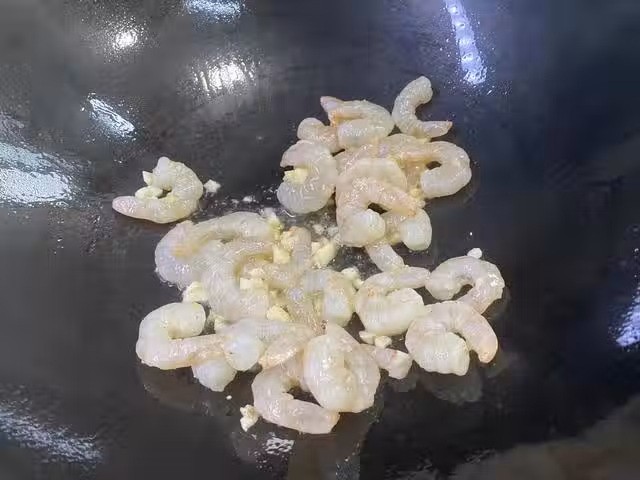 步驟3:起鍋燒油,加入蝦仁煸炒片刻,炒至變色。