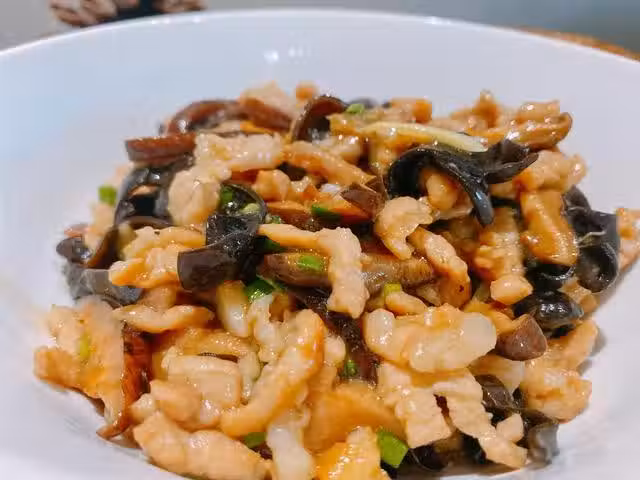 食材:豬肉、香菇、木耳、蔥蒜、澱粉、鹽、生抽、老抽、料酒、食用油。