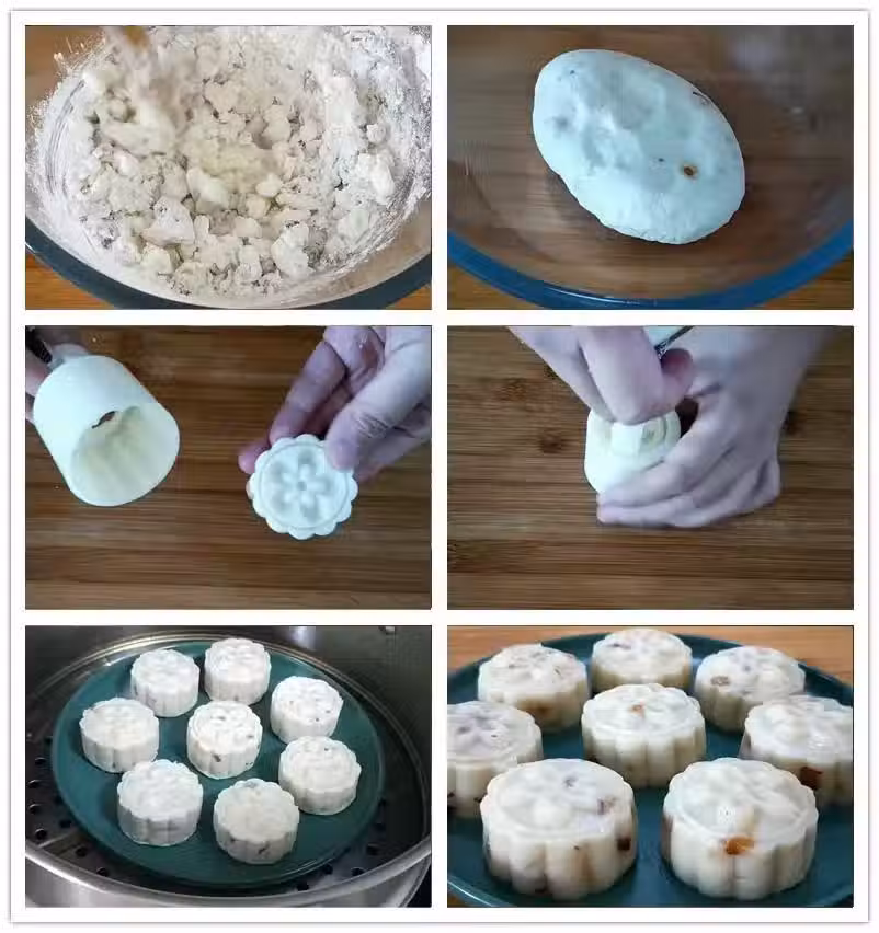 第二十二步:放山藥糯米糰放到模具中,像這樣壓出漂亮的形狀即可,一個生胚就完成了