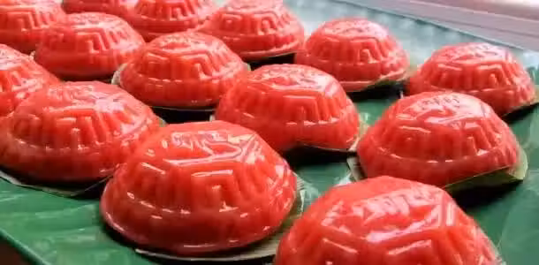 3) 把面團分層每份45g, 包入餡料, 在灑上粉的模型列印,取出, 把多於的粉掃掉,