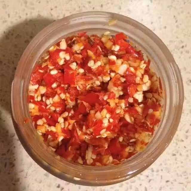 找一個乾淨無水無油的容器,放入攪拌好的辣椒醬,密封好放進冰箱。一周後就可以吃了。