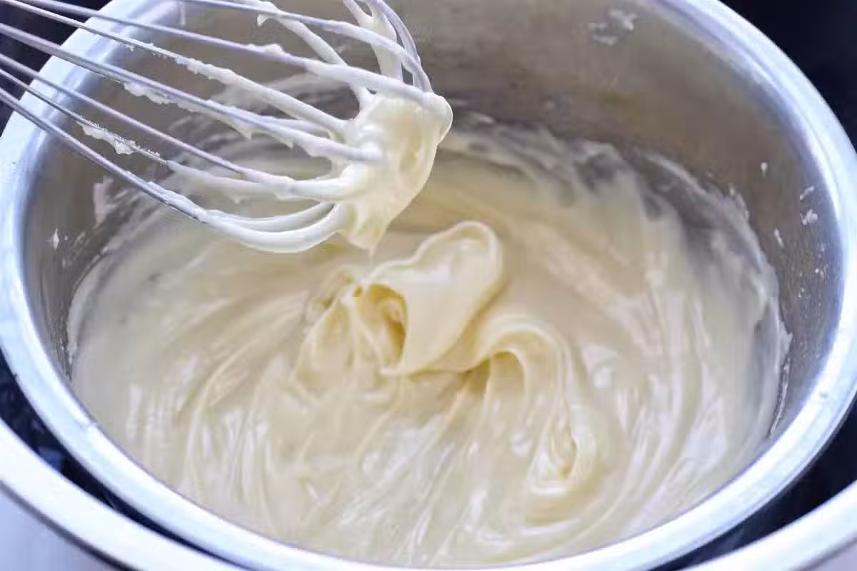 3.淡奶油分三次加到奶油乳酪中,每加一次都要充分攪拌均勻後再加入下一次的。