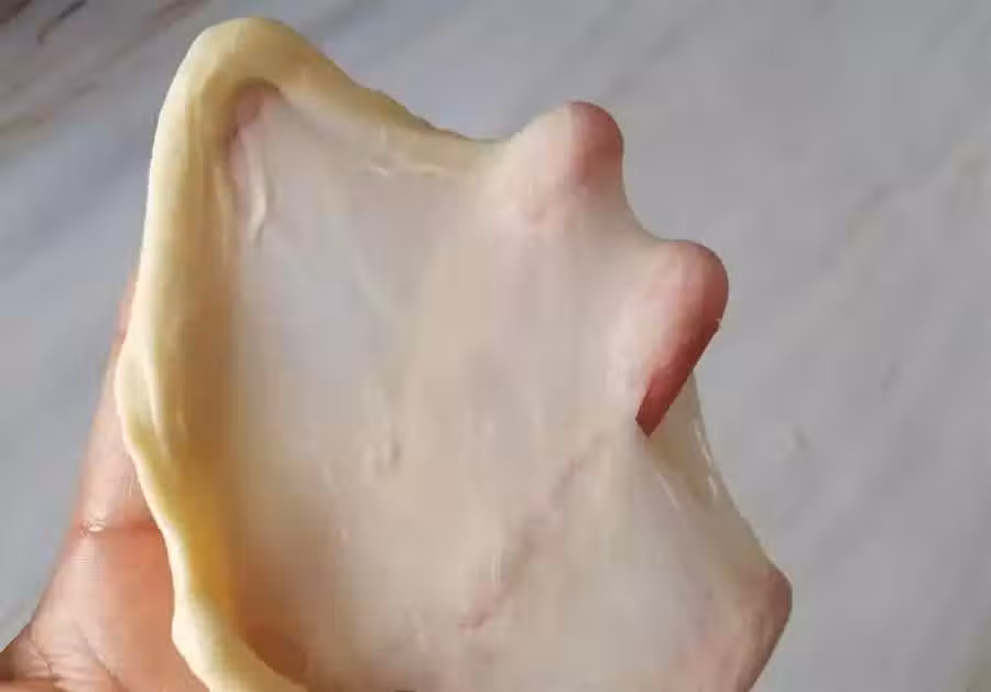 4、取一小塊麵團,用手一拉,可以輕鬆地拉出這樣的手套膜就行了,麵團放到溫暖處發酵,我們都是在家裡做麵包,可能大多數人沒有發酵箱,因為麵團發酵需要溫度和濕度,我們可以把麵團蓋上保鮮膜放到烤箱裡發酵,放上一碗熱水,這樣就有水蒸氣了,發好的麵團水分流失也小一些。