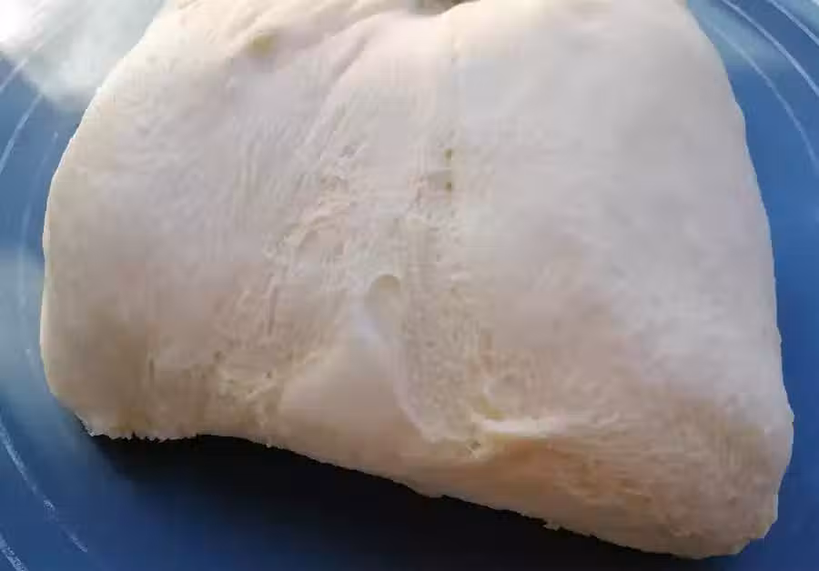 5、經過2個多小時的發酵麵團發好了,體積也變成了原來的2.5倍大,把麵團取出排氣。