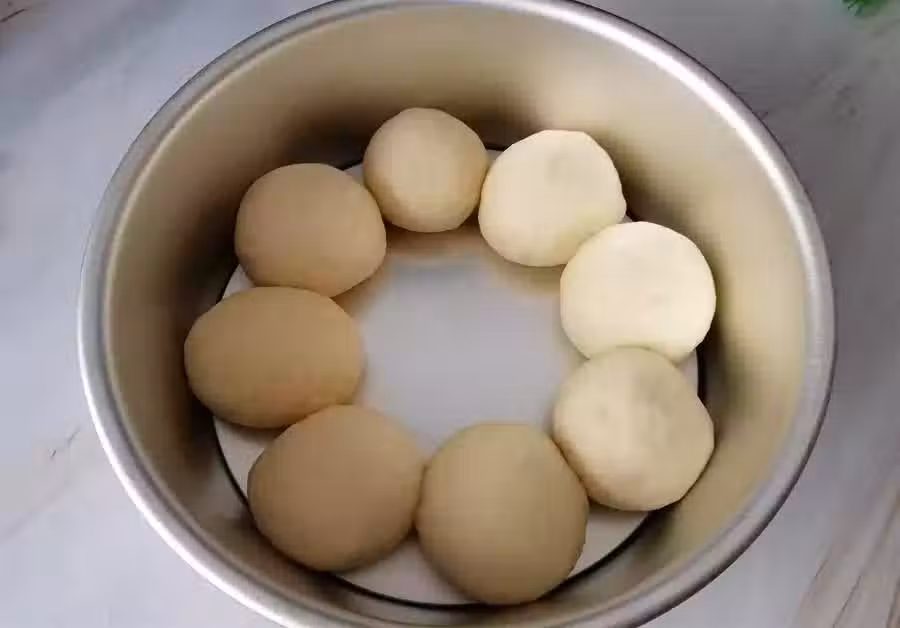 8、找一個8寸的戚風蛋糕模具,裡邊刷上薄薄的一層油,然後把揉好的小圓球放進去,蓋上保鮮膜,進行二次發酵。