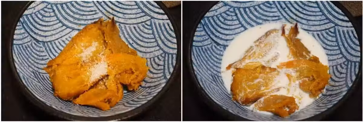 1.地瓜可以是蒸熟的,也可以是烤熟的,反正我這個就是吃剩下的一塊,給它去皮,糖加不加都行,看你用的什麼地瓜了,如果是蜜薯,本身就有甜味了,可有的人就喜歡特別甜,這個自己看情況加糖吧,每個人口味也不同,我就加一勺吧。然後加入牛奶,給它弄稀一點,牛奶的用量也得看地瓜的幹濕度,品種不同,沒辦法特別規定用量,主要看第二步吧。