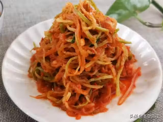 8.放入蘿蔔絲,帶上一次性手套,把蘿蔔絲和調料一起抓勻,放1-2個小時,使調料的味道融入到蘿蔔絲里,到時間後就可以吃了。剩下的裝進保鮮盒,放在陰涼處或者冰箱內冷藏保存。