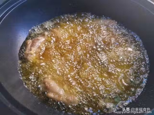 6、炸好的雞翅撈出來控油,然後放入鍋中復炸一次。這樣會更酥脆,復炸的時間在15秒左右即可。