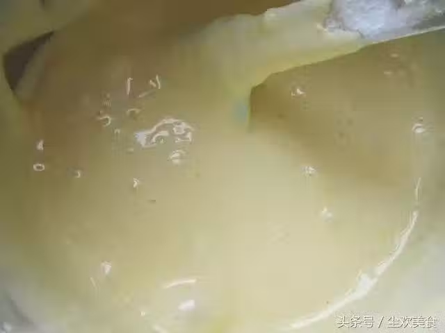 9、然後倒入牛奶和黃油的混合液,再次攪拌均勻。