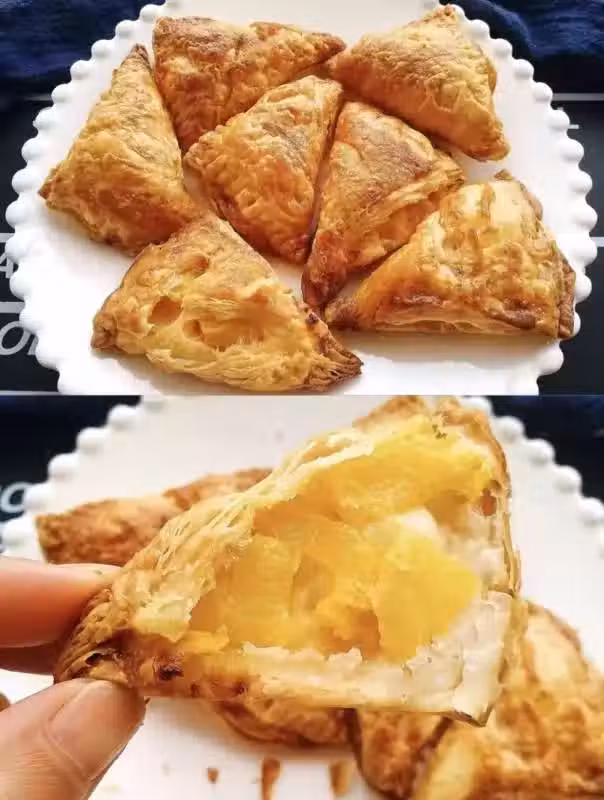 (一)手抓餅分成4等份,放入芒果肉對摺,用叉子壓邊封口