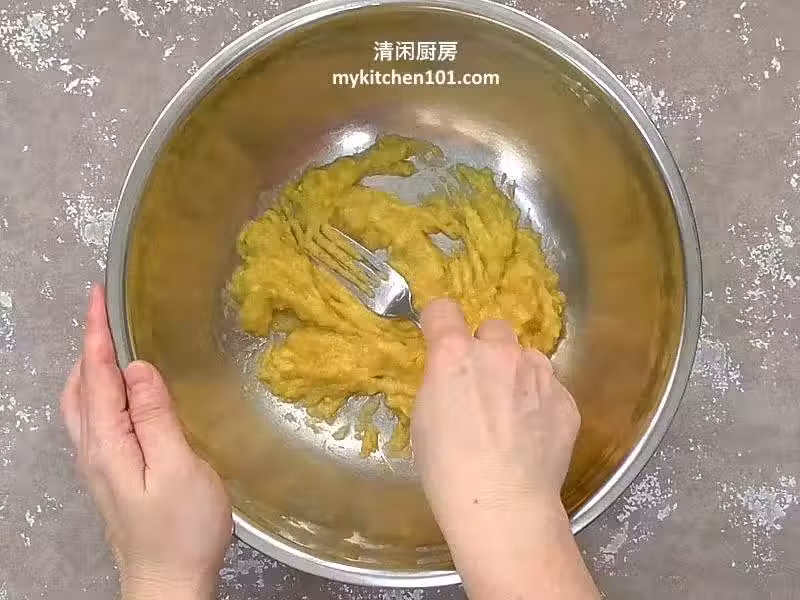 4 把蛋、砂糖和鹽放入攪拌碗攪拌至混合。