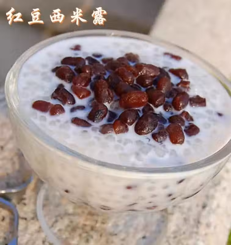 材料:小西米100克、蜜紅豆150克、牛奶250毫升、煉乳適量