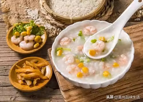 冰凍蝦仁需要解凍並在加有白醋的水中浸泡除去腥味。大米加適量的水煮沸後關小火煮至米粒發漲,注意經常攪拌。加入薑蓉、速凍青豆、玉米粒煮至青豆、玉米粒、大米都成熟,加入蝦仁煮至蝦仁成熟即可。盛出時撒上鹽和白鬍椒。