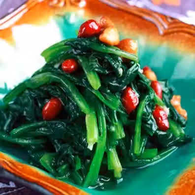 菠菜200克 、花生仁30克、腰果20克。大蒜3瓣、鹽2克 、米醋10克、香油2克 、植物油20克。