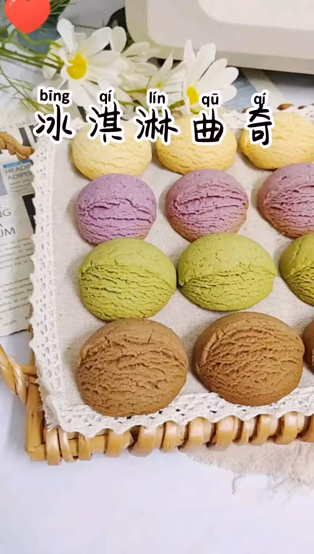 專門去買了一個雪球勺子做這個曲奇,做了4種口味,有原味、紫薯、抹茶、可可,做好都不捨得吃掉了!