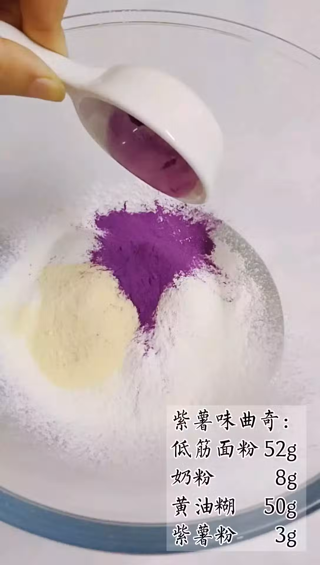 步驟9:紫薯味曲奇:低筋麵粉52克,奶粉8克,紫薯粉3克,黃油糊50克