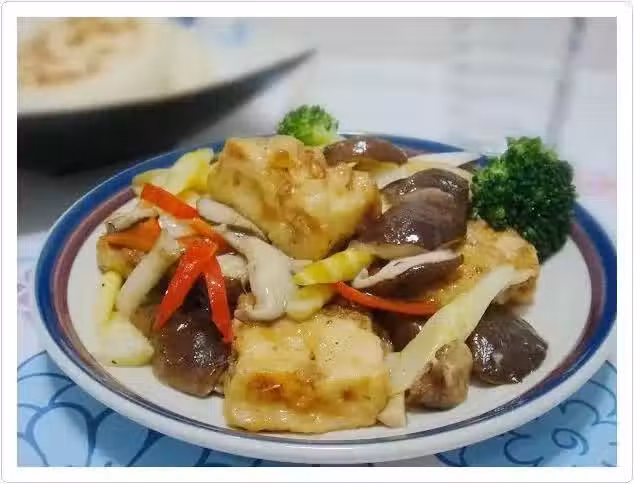 1、豆腐切大塊,放入麵粉、鹽調製的麵糊中掛糊,再放入油鍋中炸至金黃色,撈出,控干油;