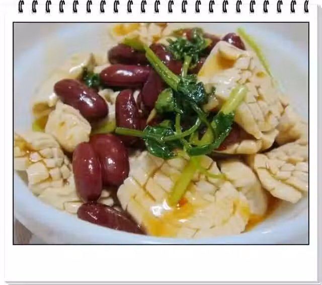 起鍋熱油,凍豆腐先下鍋,炒到微黃,然後加入蜜豆和紅辣椒,一起翻炒,用鹽、蘑菇精調味即可。