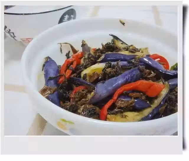 1、茄子切成一厘米寬、三厘米長的條狀,略擠干水份,放入油中炸至軟,撈出,控干油;霉乾菜用水泡開,洗凈後,擠干水份;紅尖椒切絲。