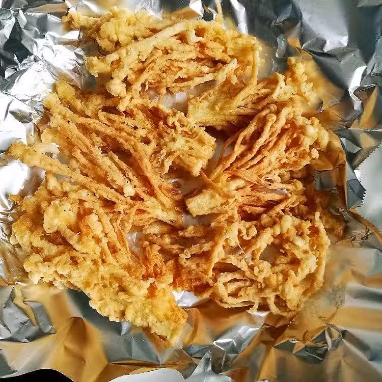 3. 起油鍋,六成熱下金針菇中火炸至金黃。