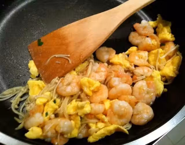 3. 取出蛋,加入蔥姜,炒香,加入蝦,炒至變紅,加入金針菇,炒至菇軟了,加入炒熟的雞蛋,略炒即可。
