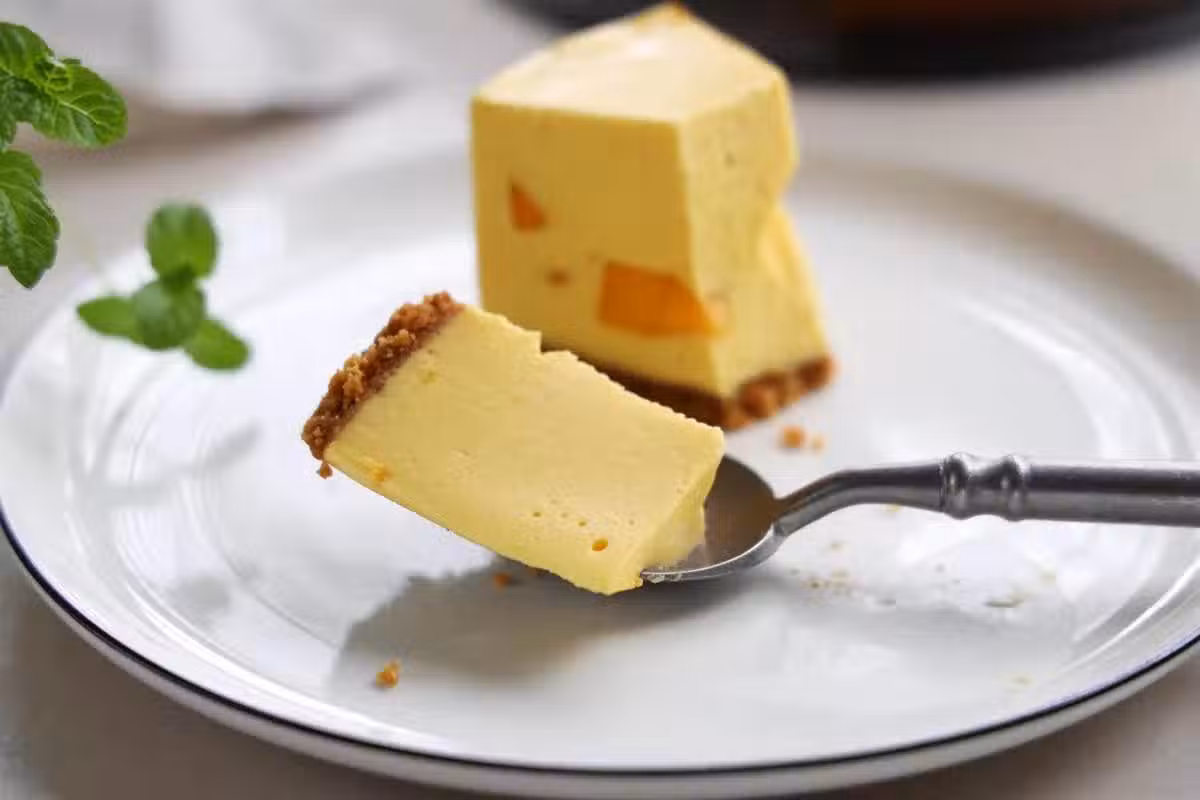 製作配料:消化餅干100克 黃油40克 吉利丁片15克 奶油250克 芒果500克 牛奶50克 白糖35克
