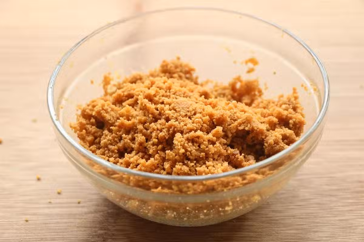2、再把餅干碎放在模具底部,用搟麵杖壓實;放在冰箱冷藏備用;