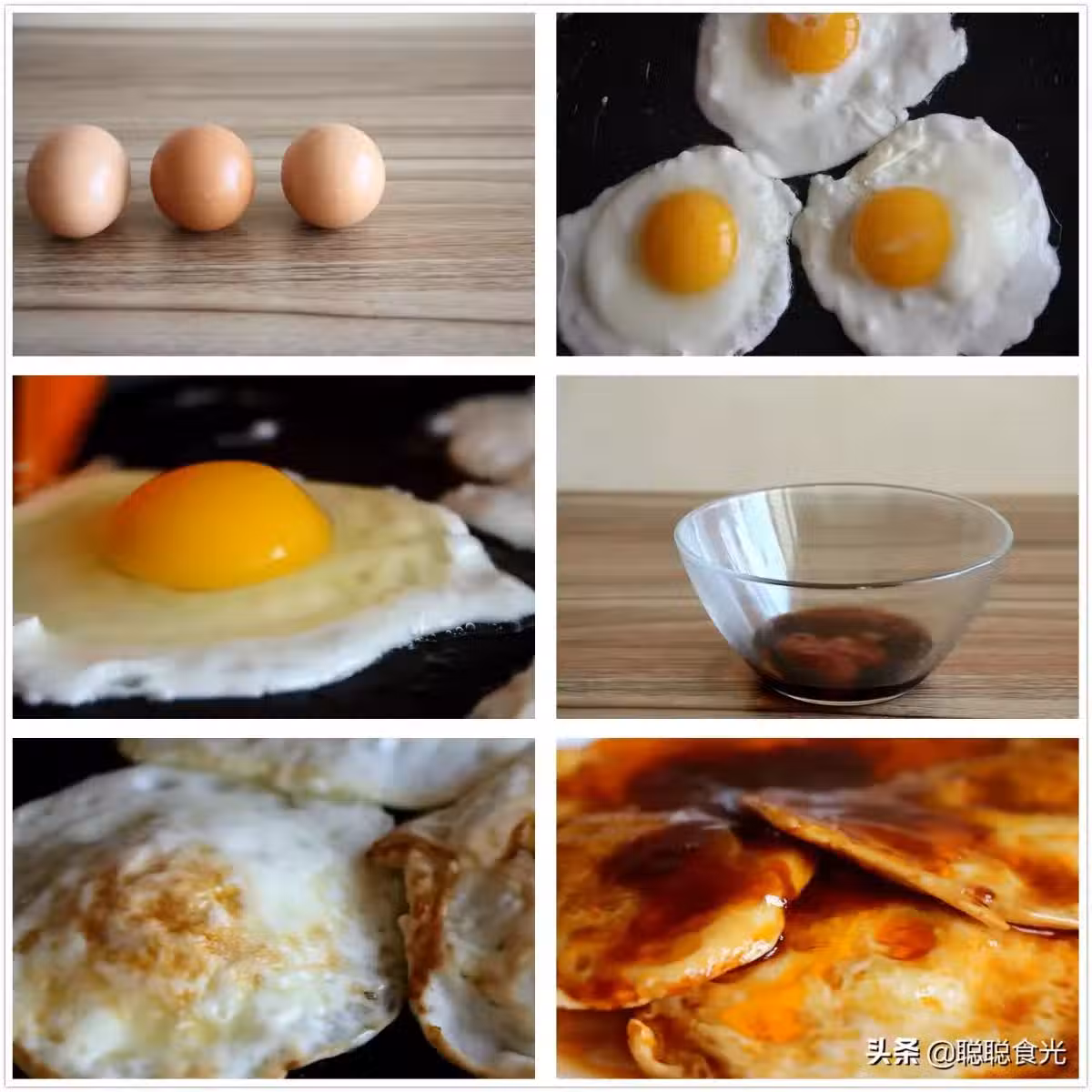 2、平底鍋刷油,開小火,輕輕地依次打入三個雞蛋,小火慢慢將底面煎熟。