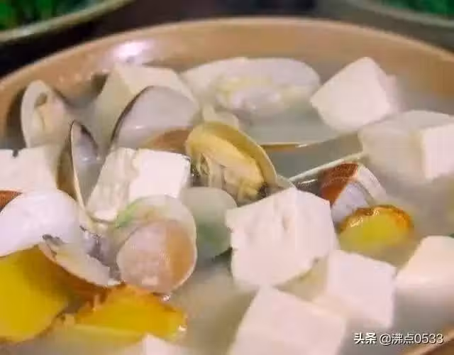 材料:蛤蜊,內酯豆腐,蔥,姜,一小塊火腿,白鬍椒粉,鹽,高湯