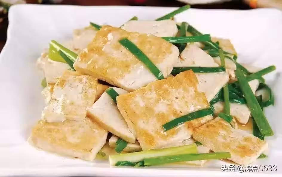 1、首先將滷水豆腐切成8厘米長,5厘米寬、0.6厘米厚的片。