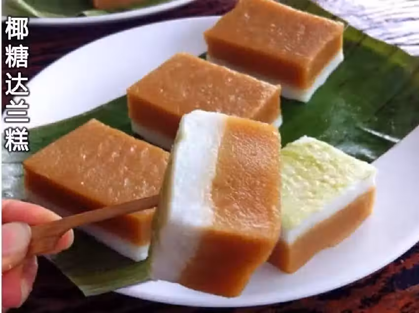 椰糖(剁碎)150克,黃糖 1/4tbsp,清水 7tbsp,香蘭葉(洗凈打結)3片,粘米粉 65g,麵粉1tsp, 椰漿 300ml(用100ml濃椰漿及200ml水)