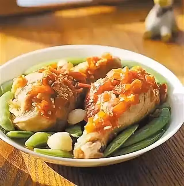 4.再將雞腿蒸上二十分鐘;拿出來後將甜豆擺在旁邊。