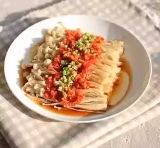 金針菇300克、剁椒2湯匙、細香蔥2根、植物油1湯匙、蒸魚豉油1湯匙。