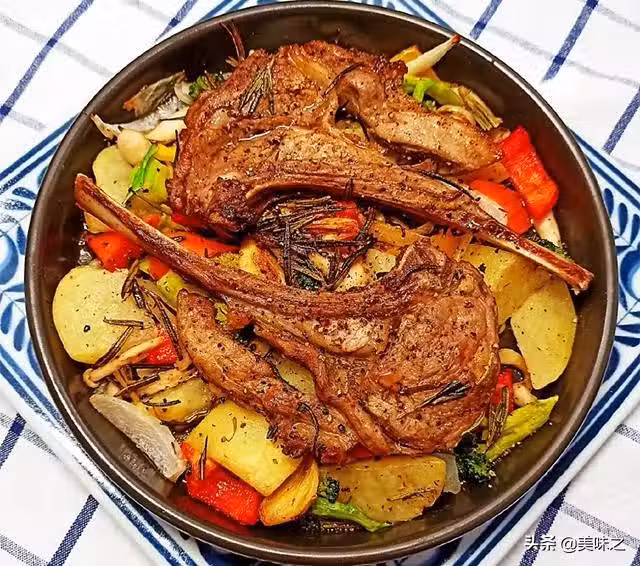 法式羊排2塊、迷迭香1小枝、海鹽2g、橄欖油1小勺、土豆半個、胡蘿蔔50g、白玉菇適量、西蘭花適量、紅菜椒適量、洋蔥40g、現磨黑胡椒碎適量、海鹽2g、迷迭香1小枝、百里香適量、橄欖油適量、大蒜5個、黃油5g、黃彩椒適量。